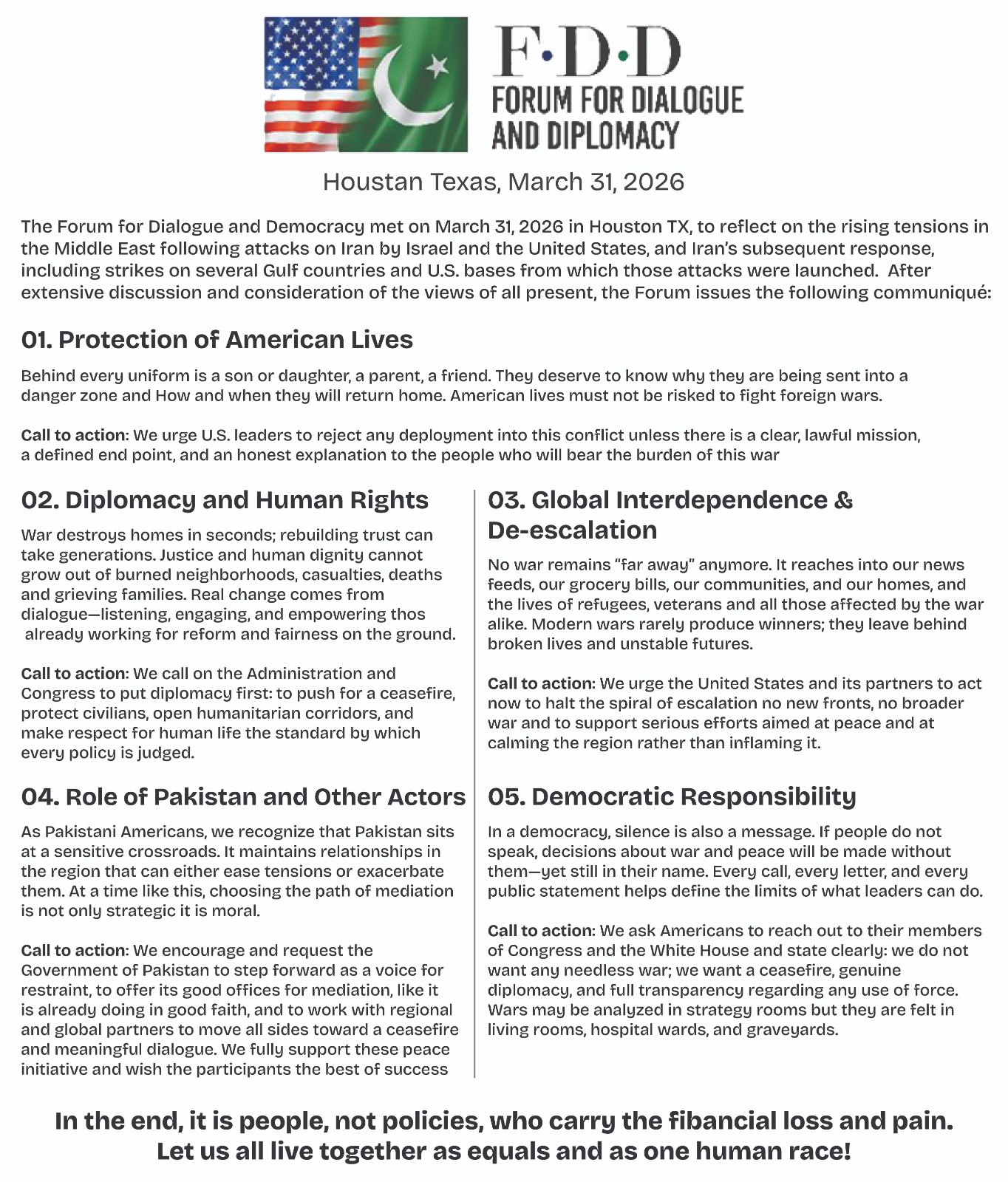 Brainstorming session on the Israel/US - Iran War and its Impact on Pakistan, March 23 2026 at 3.30 pm, Jinnah Library / Quaid e Foundation, Houston.